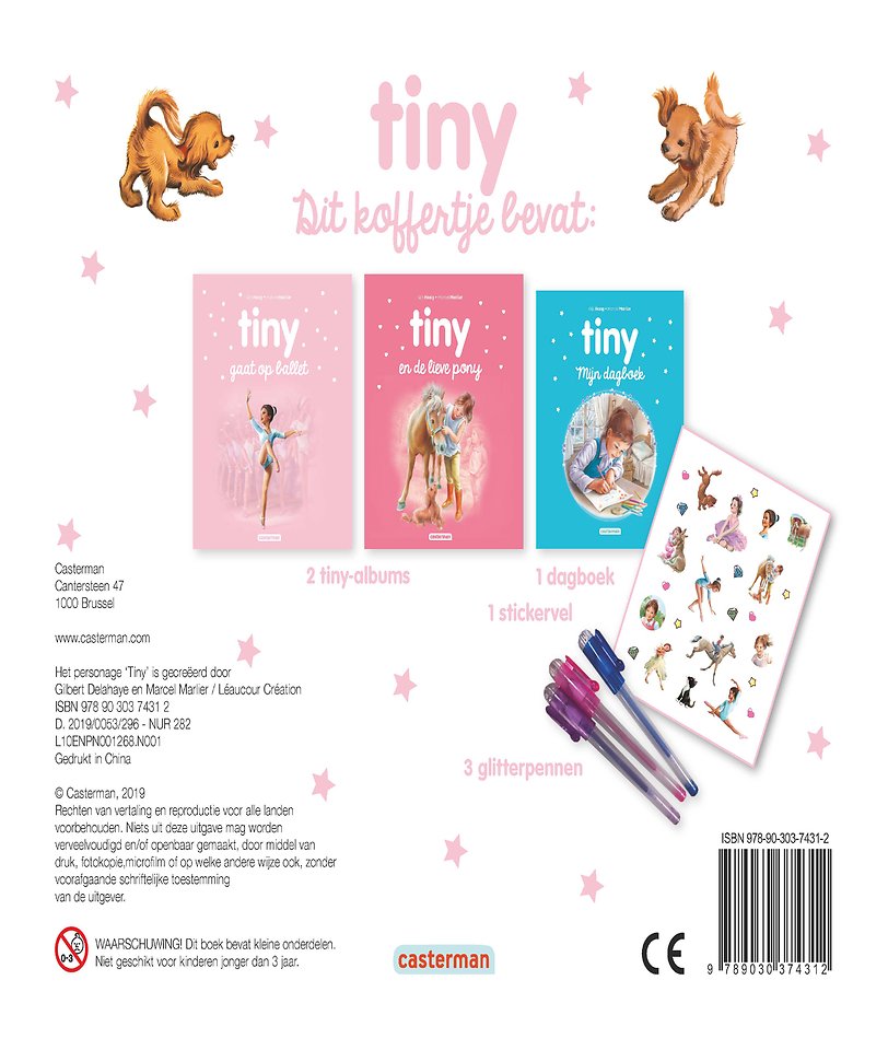 Na het schoolkoffertje heeft Tiny nu ook een cadeaukoffertje. Twee leesboeken zorgen voor vertier en met het stickervel leuk je alles van je schrift tot de ijskast op. In het Tiny dagboek schrijf je al je belevenissen van die dag neer, met één van de drie schitterende glitterpennen natuurlijk. En daarna, hup, alles weer veilig in het koffertje.