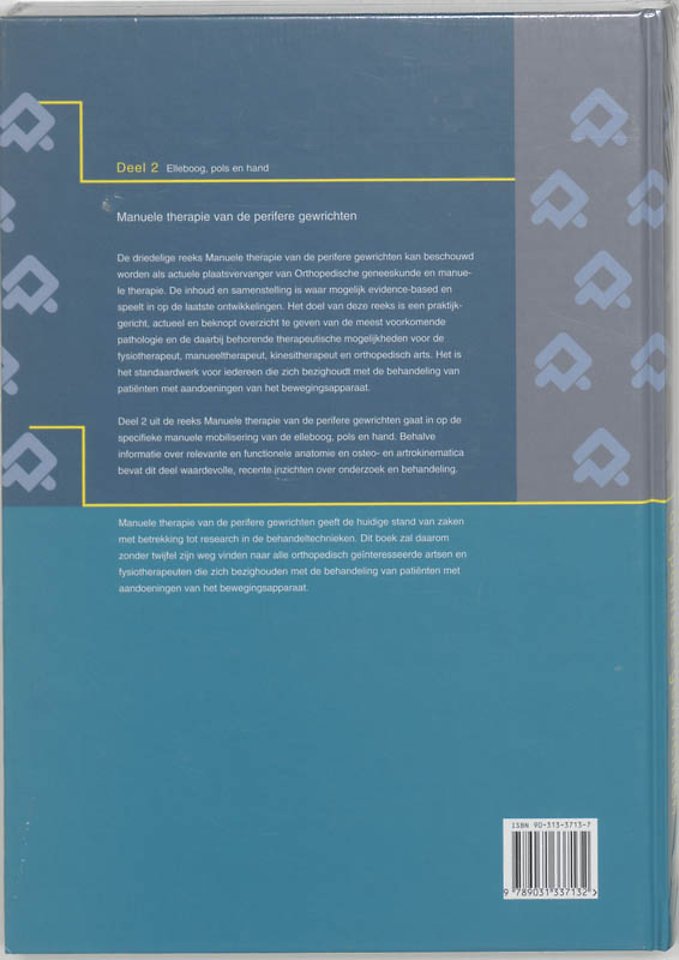Deel 2 uit de nieuwe reeks Manuele therapie van de perifere gewrichten gaat in op de specifieke manuele mobilisering van de elleboog, pols en hand. Behalve informatie over relevante en functionele anatomie en osteo– en artrokinematica bevat dit deel waardevolle, recente inzichten over onderzoek en behandeling.De driedelige reeks Manuele therapie van de perifere gewrichten komt in plaats van het eerder aangekondigde deel 3c, Orthopedische geneeskunde en manuele therapie. De inhoud en samenstelling is geactualiseerd, waar mogelijk evidence–based en inspelend op de laatste ontwikkelingen.Reeds verschenen: Deel 1: algemeen, bindweefsel, schouder – ISBN 90 313 3712 9Deel 3: heup, knie, enkel, voet, kraakbeen – ISBN 90 313 3714 5