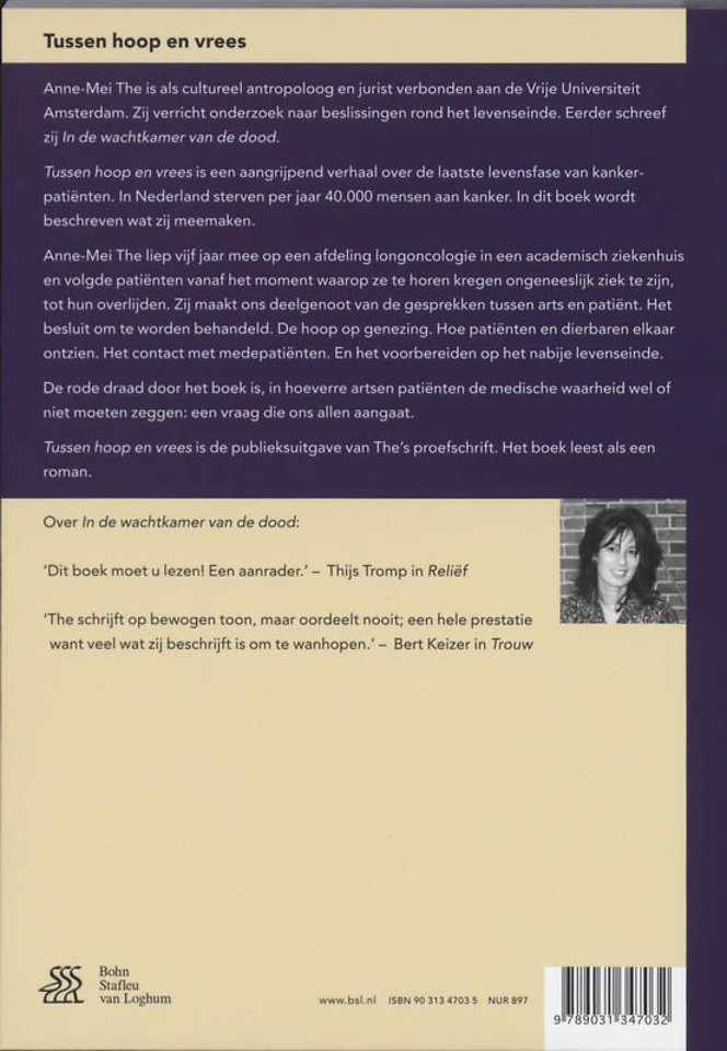 Tussen hoop en vrees is een aangrijpend verhaal over de laatste levensfase van kankerpatiënten. In Nederland sterven per jaar 40.000 mensen aan kanker. In dit boek wordt beschreven wat zij meemaken.Anne-Mei The liep vijf jaar mee op een afdeling longoncologie in een academisch ziekenhuis en volgde patiënten vanaf het moment waarop ze te horen kregen ongeneeslijk ziek te zijn tot hun overlijden. Zij maakt ons deelgenoot van de gesprekken tussen arts en patiënt. Het besluit om te worden behandeld. De hoop op genezing. Hoe patiënten en dierbaren elkaar ontzien. Het contact tussen medepatiënten. En het voorbereiden op het nabije levenseinde.De rode draad door het boek is in hoeverre artsen patiënten de medische waarheid wel of niet moeten zeggen: een vraag die ons allen aangaat.Tussen hoop en vrees is de publieksuitgave van The's proefschrift.