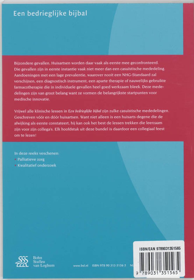 Bijzondere gevallen. Huisartsen worden daar vaak als eerste mee geconfronteerd. Die gevallen zijn in eerste instantie vaak niet meer dan een casuïstische mededeling. Over aandoeningen met een lage prevalentie, waarover nooit een NHG–Standaard zal verschijnen, over een diagnostisch instrument, een aparte therapie of nauwelijks gebruikte farmacotherapie die in individuele gevallen heel goed werkzaam bleek. Maar die mededelingen zijn van groot belang want ze vormen de belangrijkste startpunten voor medische innovatie.Vrijwel alle klinische lessen in Een bedrieglijke bijbal zijn zulke casuïstische mededelingen. Geschreven vóór en dóór huisartsen. Want niet alleen is een huisarts degene die de afwijking als eerste constateert, hij kan ook het best de lessen trekken die leerzaam zijn voor zijn collega's. Elk hoofdstuk uit deze bundel is daardoor een collegiaal feest om te lezen!In deze reeks verschenen: Palliatieve zorg Kwalitatief onderzoek