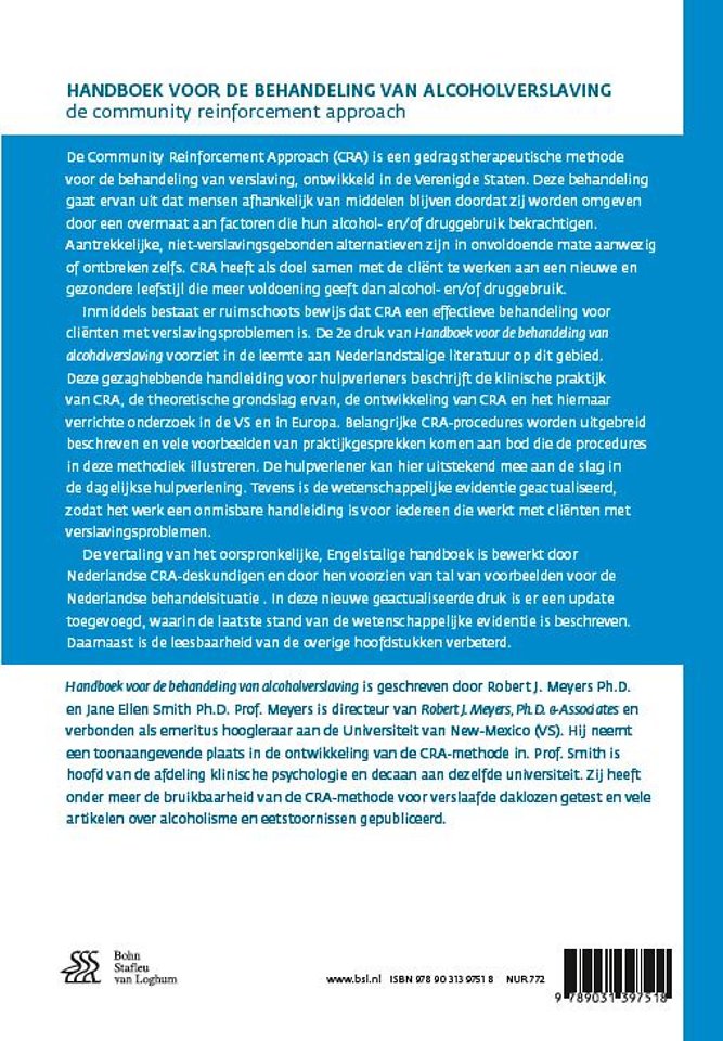 Inmiddels bestaat er ruimschoots bewijs dat CRA een effectieve behandeling voor cliënten met verslavingsproblemen vormt. Tot op heden was er geen Nederlandstalige handleiding over CRA beschikbaar. Het Handboek voor de behandeling van alcoholverslaving voorziet in deze leemte. Deze gezaghebbende handleiding voor hulpverleners beschrijft helder en in detail de klinische praktijk van CRA, de theoretische grondslag ervan, de ontwikkeling van CRA en het hiernaar verrichte onderzoek in de VS en in Europa. Voorts gaat het boek uitgebreid in op belangrijke CRA�procedures en biedt het vele voorbeelden van praktijkgesprekken die de procedures in deze methodiek illustreren. Voor alle afzonderlijke behandelonderdelen presenteren de auteurs een stappenplan. Ook geven zij nauwgezette aanwijzingen voor het uitvoeren van assessments en de behandeling van cliënten. Aan de orde komen voorts problemen tijdens de gedragstherapie en strategieën om deze te overwinnen.