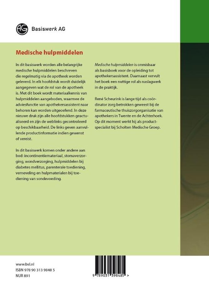 In dit basiswerk worden alle belangrijke medische hulpmiddelen beschreven die regelmatig via de apotheek worden geleverd. In elk hoofdstuk wordt duidelijk aangegeven wat de rol van de apotheek is. Met dit boek wordt materiaalkennis van hulpmiddelen aangeboden, waarmee de adviesfunctie van apothekersassistent naar behoren kan worden uitgeoefend. In deze nieuwe druk zijn alle hoofdstukken geactualiseerd en zijn de weblinks gecontroleerd op beschikbaarheid. De links geven aanvullende productinformatie indien gewenst of vereist. In dit basiswerk komen onder andere aan bod: incontinentiemateriaal, stomaverzorging, wondverzorging, hulpmiddelen bij diabetes mellitus, parenterale toediening, verneveling en hulpmaterialen bij toediening van sondevoeding. Medische hulpmiddelen is onmisbaar als basisboek voor de opleiding tot apothekers assistent. Daarnaast vervult het boek een nuttige rol als naslagwerk in de praktijk.