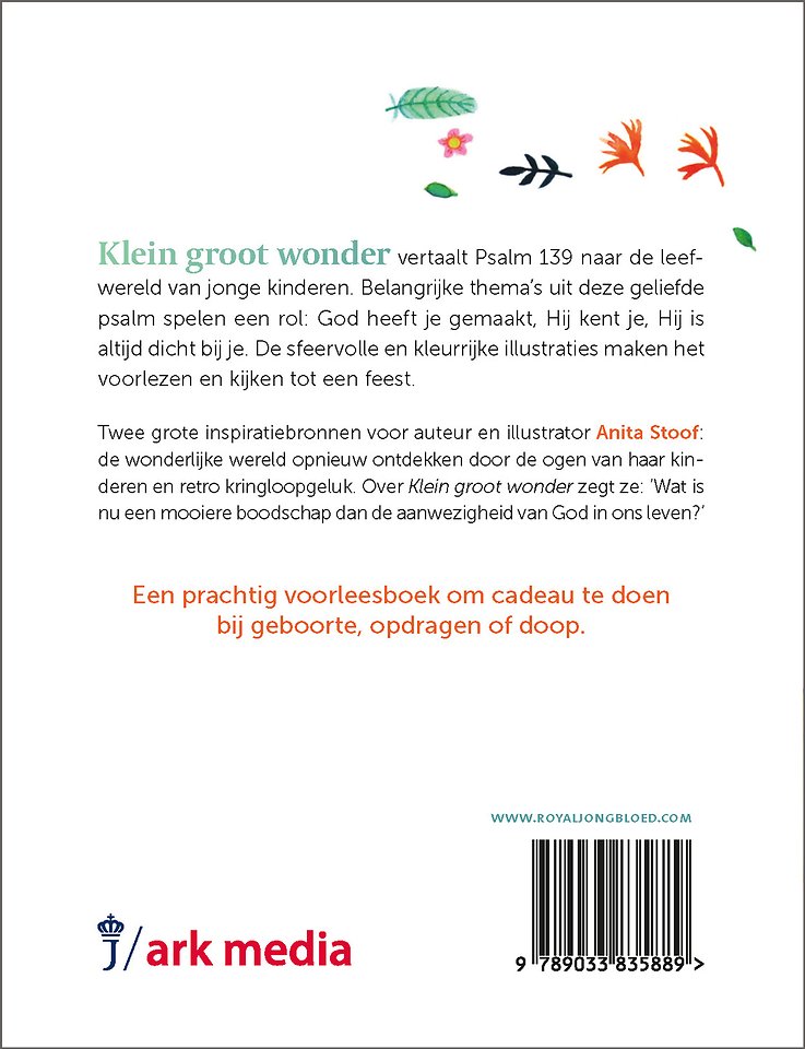 Klein groot wonder vertaalt Psalm 139 naar de leefwereld van jonge kinderen. Belangrijke thema’s uit deze geliefde psalm spelen een rol: God heeft je gemaakt, Hij kent je, Hij is altijd dicht bij je. De sfeervolle en kleurrijke illustraties maken het voorlezen en kijken tot een feest.'Toen je nog niet geboren was, maakte God je in de buik van je moeder. Hij kent je. Hij weet waar je heen gaat. Waar je ook bent, God is daar ook!'