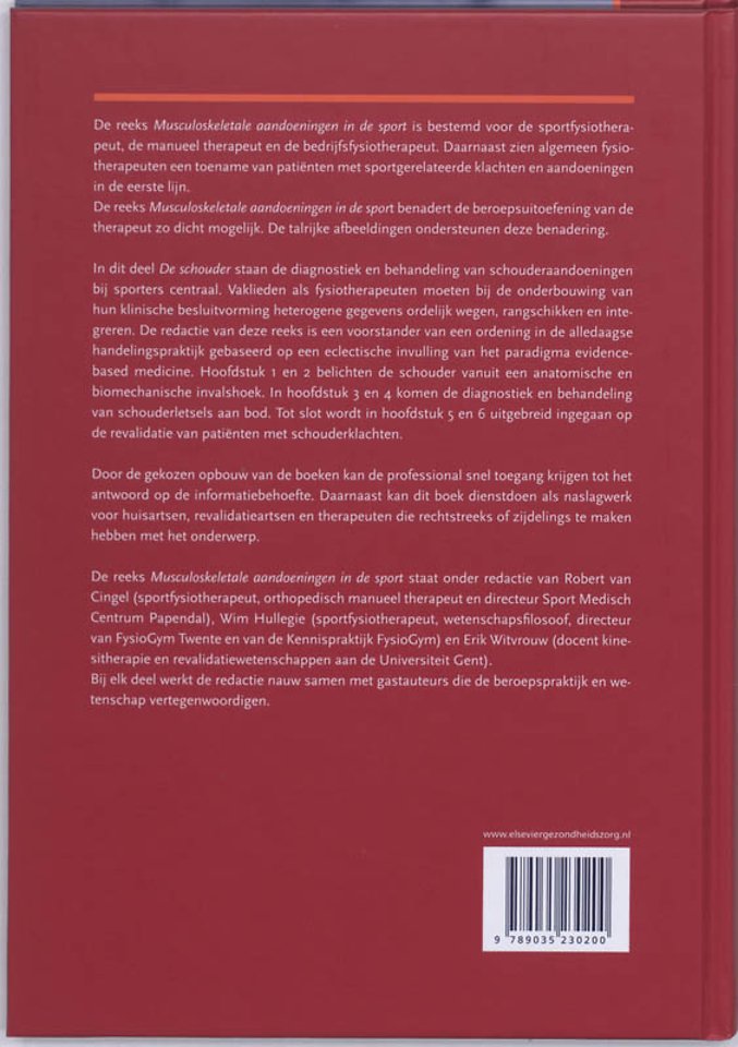 In dit deel 'De schouder' staan de diagnostiek en behandeling van schouderaandoeningen bij sporters centraal. Vaklieden als fysiotherapeuten moeten bij de onderbouwing van hun klinische besluitvorming heterogene gegevens ordelijk wegen, rangschikken en integreren. De redactie van deze reeks is een voorstander van een ordening in de alledaagse handelingspraktijk gebaseerd op een eclectische invulling van het paradigma evidence-based medicine. Hoofdstuk 1 en 2 belichten de schouder vanuit een anatomische en biomechanische invalshoek. In hoofdstuk 3 en 4 komen de diagnostiek en behandeling van schouderletsels aan bod. Tot slot wordt in hoofdstuk 5 en 6 uitgebreid ingegaan op de revalidatie van patiënten met schouderklachten.