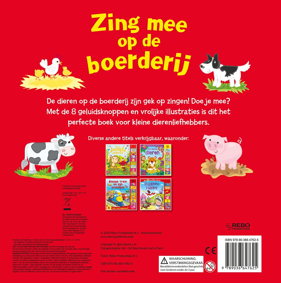 De dieren op de boerderij zijn gek op zingen! Doe je mee? Met 8 geluidsknoppen en vrolijke illustraties is dit het perfecte boek voor kleine dierenliefhebbers.