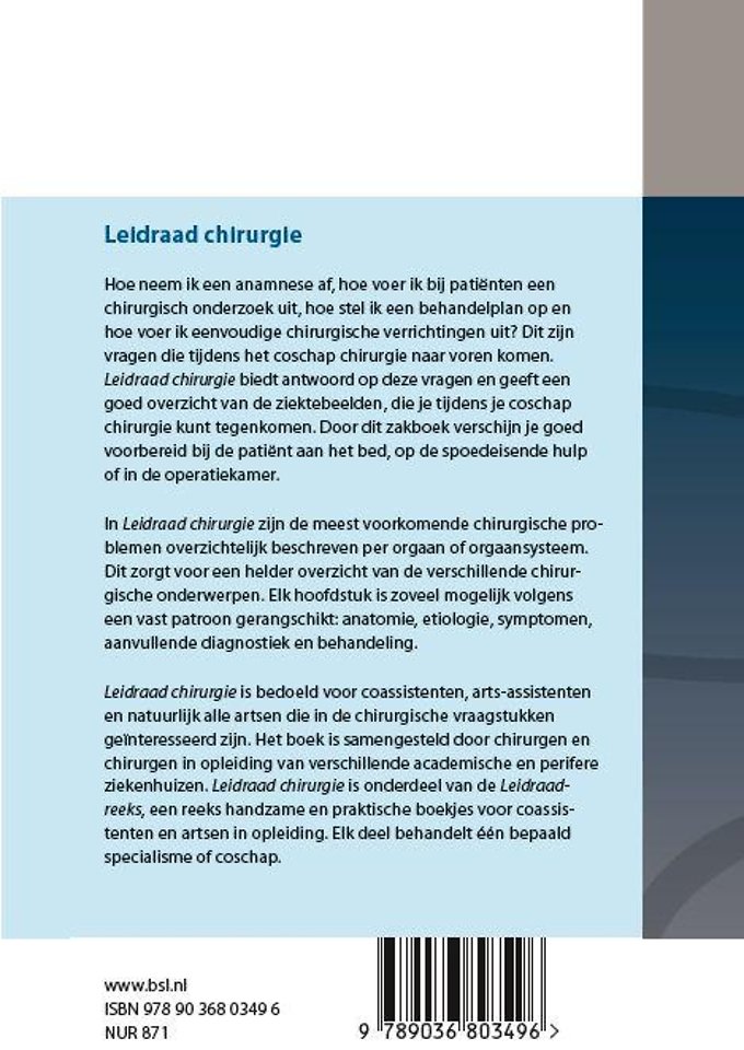 Hoe neem ik een anamnese af, hoe voer ik bij patiënten een chirurgisch onderzoek uit, hoe stel ik een behandelplan op en hoe voer ik eenvoudige chirurgische verrichtingen uit? Dit zijn vragen die tijdens het coschap chirurgie naar voren komen. Leidraad chirurgie biedt antwoord op deze vragen en geeft een goed overzicht van de ziektebeelden, die je tijdens je coschap chirurgie kunt tegenkomen. Door dit zakboek verschijn je goed voorbereid bij de patiënt aan het bed, op de spoedeisende hulp of in de operatiekamer.