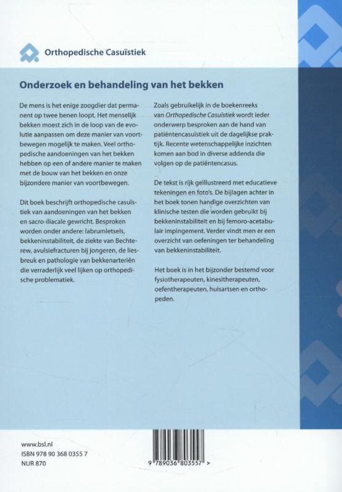 Dit boek beschrijft orthopedische casuïstiek van aandoeningen van het bekken en sacro-iliacale gewricht. Besproken worden onder andere: labrumletsels, bekkeninstabiliteit, de ziekte van Bechterew, avulsiefracturen bij jongeren, de liesbreuk en pathologie van bekkenarteriën die verraderlijk veel lijken op orthopedische problematiek.