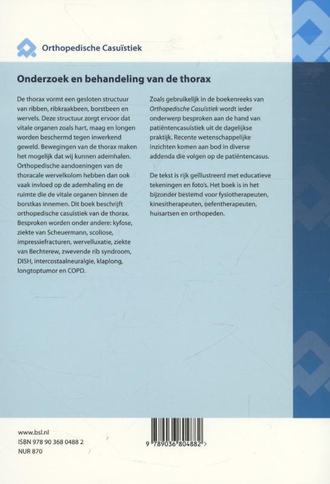 Dit boek beschrijft orthopedische casuïstiek van de thorax. Besproken worden onder andere: kyfose, ziekte van Scheuermann, scoliose, impressiefracturen, wervelluxatie, ziekte van Bechterew, zwevende rib syndroom, DISH, intercostaalneuralgie, klaplong, longtoptumor en COPD.