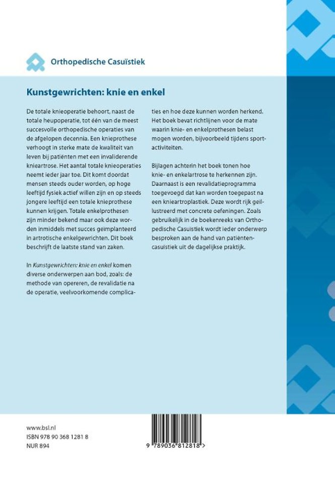 Dit boek geeft aan de hand van een groot aantal casuïstiekbeschrijvingen een concreet beeld van de klachten, symptomen, diagnostiek en therapeutische mogelijkheden over kunstgewrichten van knie en enkel. Relevante achtergrondinformatie wordt uitgebreid besproken en is gebaseerd op actuele wetenschappelijke inzichten. De tekst is rijk geïllustreerd met educatieve tekeningen en foto's. Het boek is in het bijzonder bestemd voor fysiotherapeuten, kinesitherapeuten, oefentherapeuten, huisartsen en orthopeden.