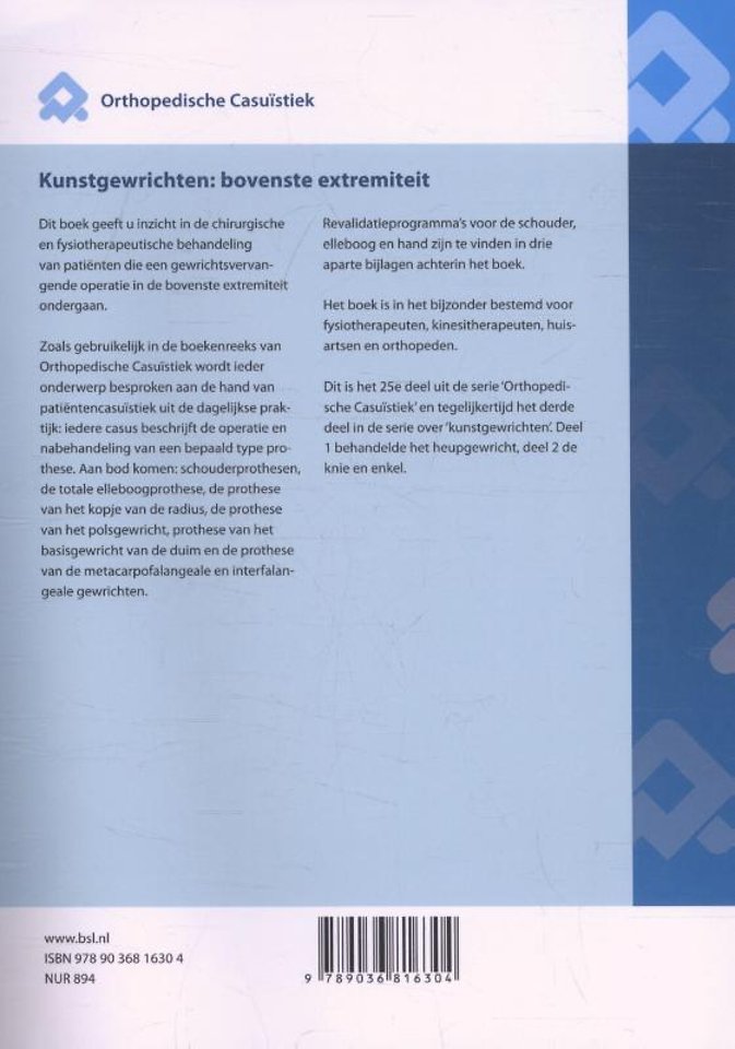Dit boek geeft aan de hand van een groot aantal casuïstiekbeschrijvingen een concreet beeld van de klachten, symptomen, diagnostiek en therapeutische mogelijkheden bij patiënten met kunstgewrichten van de bovenste extremiteit. Relevante achtergrondinformatie wordt uitgebreid besproken en is gebaseerd op actuele wetenschappelijke inzichten. De tekst is rijk geïllustreerd met educatieve tekeningen en foto's. Het boek is in het bijzonder bestemd voor fysiotherapeuten, kinesitherapeuten, oefentherapeuten, huisartsen en orthopeden.