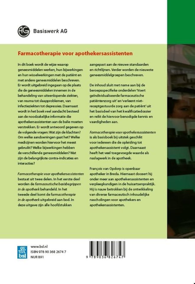 Farmacotherapie voor apothekersassistenten bestaat uit twee delen. In het eerste deel worden de farmaceutische basisbegrippen in de apotheek behandeld. In het tweede deel komt de farmacotherapie in de apotheek uitgebreid aan bod. In deze uitgave zijn alle hoofdstukken aangepast aan de nieuwe standaarden en richtlijnen. Verder worden de nieuwste geneesmiddelgroepen beschreven.