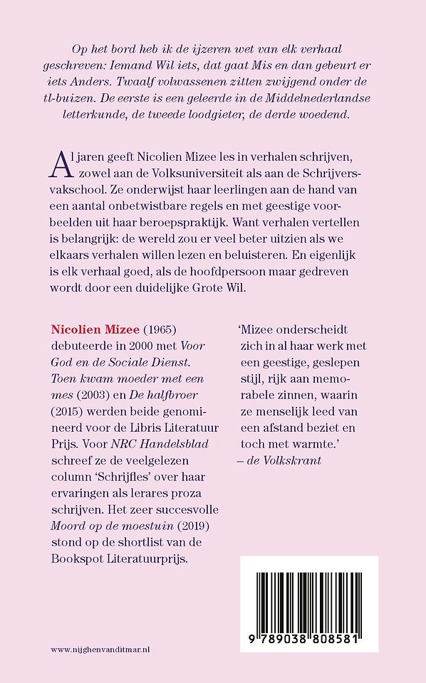 Al jaren geeft Nicolien Mizee les in verhalen schrijven, zowel aan de Volksuniversiteit als aan de Schrijversvakschool. Ze onderwijst haar leerlingen aan de hand van een aantal onbetwistbare regels en met geestige voorbeelden uit haar beroepspraktijk. Want verhalen vertellen is belangrijk: de wereld zou er veel beter uitzien als we elkaars verhalen
