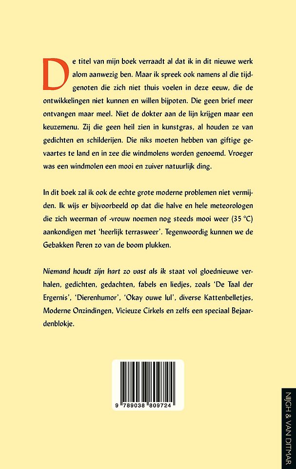 De titel van mijn boek verraadt al dat ik in dit nieuwe werk alom aanwezig ben. Maar ik spreek ook namens al die tijdgenoten die zich niet thuisvoelen in deze eeuw, die de ontwikkelingen niet kunnen en willen bijpoten. Die geen brief meer ontvangen maar meel. Niet de dokter aan de lijn krijgen maar een keuzemenu. Zij die geen heil zien in kunstgras, al houden ze van gedichten en schilderijen. Die niks moeten hebben van giftige gevaartes te land en in zee die windmolens worden genoemd. Vroeger was een windmolen een mooi en zuiver natuurlijk ding. In dit boek zal ik ook de echte grote moderne problemen niet vermijden. Ik wijs er bijvoorbeeld op dat die halve en hele meteorologen die zich weerman of -vrouw noemen nog steeds mooi weer (35 °C) aankondigen met ‘heerlijk terrasweer’. Tegenwoordig kunnen we de Gebakken Peren zo van de boom plukken.