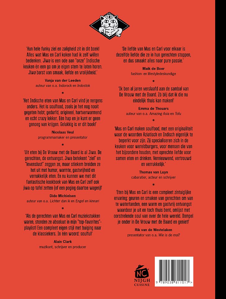 'Uit eten bij De Vrouw met de Baard is al Jiwa. De gerechten, de ontvangst. Jiwa betekent "ziel" en "levenslust" zeggen ze, maar stiekem breiden ze het uit met humor, warmte, gastvrijheid en verrukkelijk eten. En nu kunnen we met dit fantastische kookboek van Mas en Carl zelf ook jiwa op tafel zetten (of een poging daartoe wagen)!' – Dido Michielsen, auteur van o.a. Lichter dan ik en Engel en kinnari
