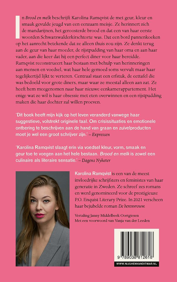 In Brood en melk beschrijft Karolina Ramqvist de met geur, kleur en smaak gevulde jeugd van een eenzaam meisje. Ze herinnert zich de mandarijnen, het geroosterde brood en dat een van haar eerste woorden Schwarzwalderkirschtorte was. Dat een bord pannenkoeken op het aanrecht betekende dat ze alleen thuis zou zijn. Ze denkt terug aan de geur van haar moeder, de rijstpudding van haar oma en aan haar vader, aan die keer dat hij een perfect diner voor haar bereidde.