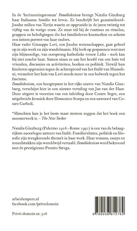 Familielexicon, een hoogtepunt in het rijke œuvre van Natalia Ginzburg, verschijnt hier in een nieuwe vertaling van Jan van der Haar. Deze uitgave is voorzien van een inleiding door Cesare Segre, een uitgebreide kroniek door Domenico Scarpa en een nawoord van Cesare Garboli.
