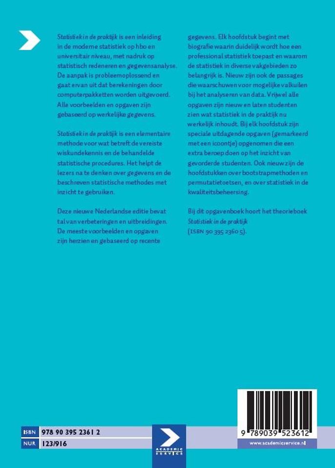 Statistiek in de praktijk is een inleiding in de moderne statistiek op hbo- en universitair niveau, met nadruk op statistisch redeneren en gegevensanalyse. De aanpak is probleemoplossend en gaat ervan uit dat berekeningen door computerpakketten worden uitgevoerd. Alle voorbeelden en opgaven zijn gebaseerd op werkelijke gegevens en praktijken.
