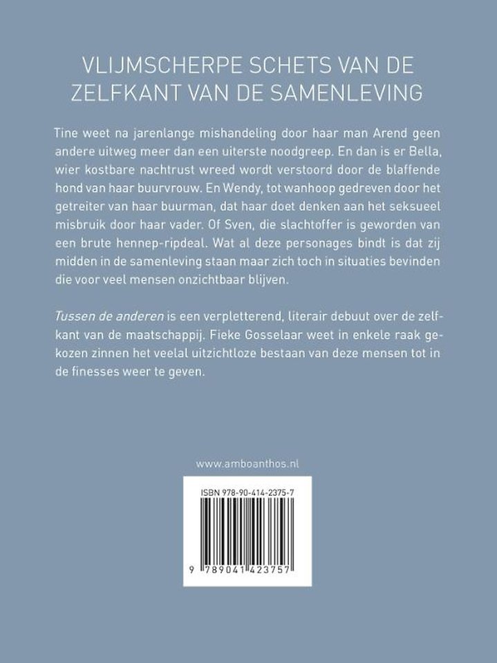 Het debuut van Fieke Gosselaar 'Tussen de anderen'draait om de zelfkant van de samenleving. Zo is er Tine, die na jarenlange mishandeling door haar man geen andere uitweg meer ziet dan een uiterste noodgreep. Of Sven, die slachtoffer is geworden van een brute hennep-ripdeal. Wat al haar personages bindt is dat zij middenin de samenleving staan, maar zich tegelijkertijd bevinden in situaties die onzichtbaar blijven voor veel mensen.