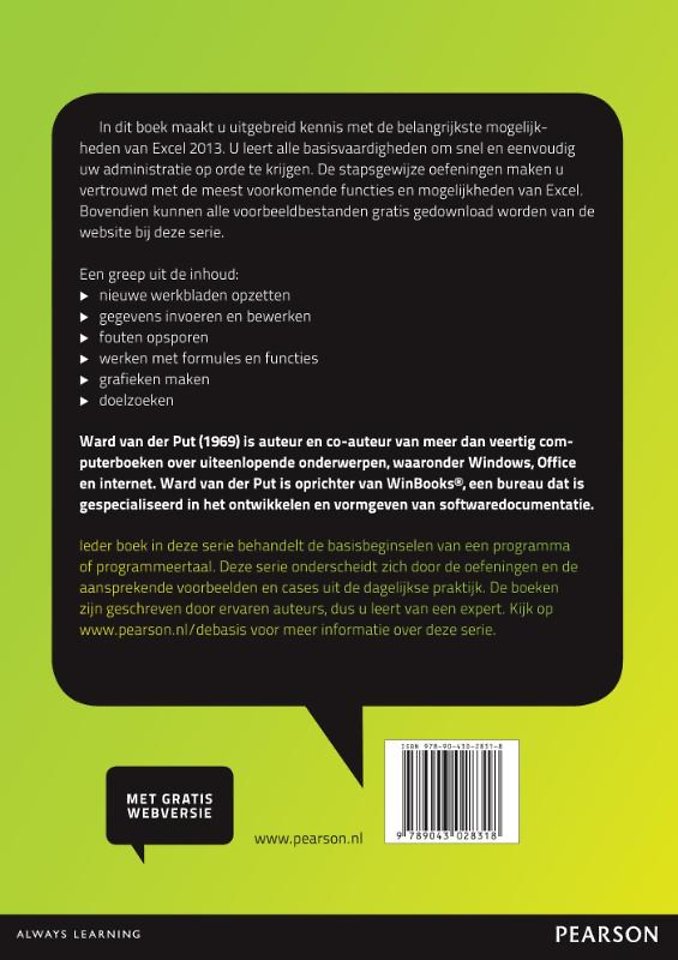 In dit boek maakt u uitgebreid kennis met de belangrijkste mogelijkheden van Excel 2013. U leert alle basisvaardigheden om snel en eenvoudig uw administratie op orde te krijgen. De stapsgewijze oefeningen maken u vertrouwd met de meest voorkomende functies en mogelijkheden van Excel. Bovendien kunnen alle voorbeeldbestanden gratis gedownload worden van de website bij deze serie.
