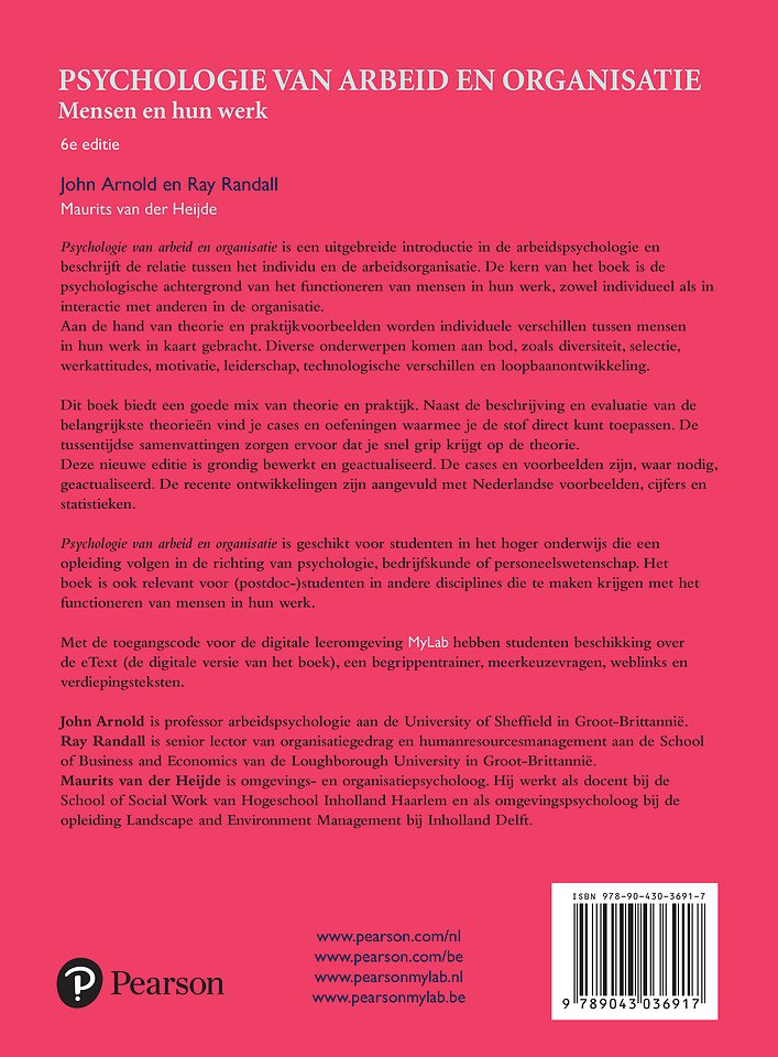Psychologie van arbeid en organisatie is een grondige introductie in de arbeidspsychologie en beschrijft de relatie tussen mensen, hun werk en de organisatie. Door gedrag, emoties en gedachten ten opzichte van werk te bestuderen, en onderzoek daarnaar te beschrijven, proberen de auteurs naast algemene kennis ook nieuwe inzichten te bieden op het gebied van selectie, motivatie, teamwerk en het beïnvloeden en aansturen van mensen in hun werk. Hierbij wordt wetenschappelijk onderzoek steeds gekoppeld aan relevante praktijkvoorbeelden.