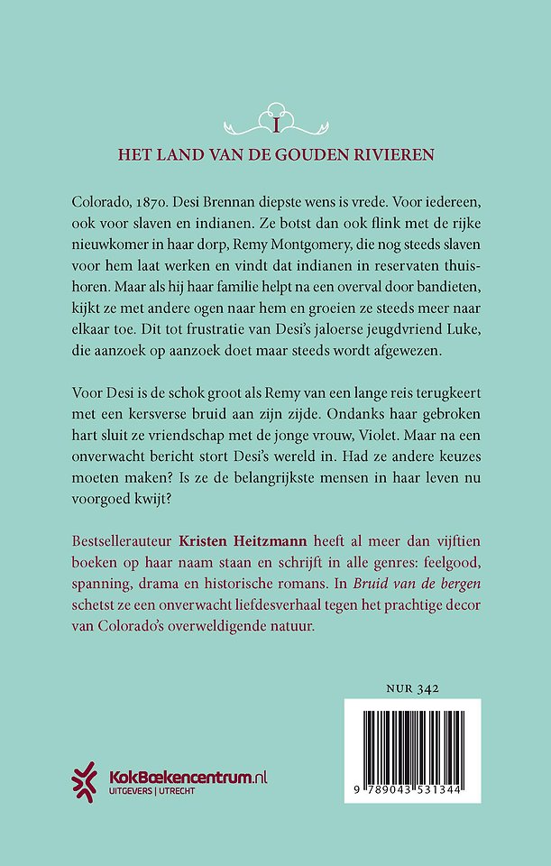 Kristen Heitzmann schetst met de historische roman ‘Bruid van de bergen’ een intens en onverwacht liefdesverhaal tegen het prachtige decor van Colorado’s overweldigende natuur. Colorado, 1870. Desi Brennan groeit op in een land dat herstellende is van de Amerikaanse Burgeroorlog. Ze verlangt naar vrede die verder voert: volledige vrijheid van slaven en indianen. Ze botst dan ook flink met de rijke nieuwkomer Remy Montgomery, die nog steeds slaven voor hem laat werken en vindt dat indianen in reservaten thuishoren. Maar als hij haar familie helpt na een overval door bandieten, kan Desi niet anders dan Remy het voordeel van de twijfel gunnen en haar liefde voor hem erkennen. Dan keert Remy terug van een lange reis met een kersverse bruid aan zijn zijde. Eenzaam stort Desi zich op haar werk voor haar vaders krant, en verzint ze met haar vader een list om de leider van de bandieten in de val te lokken. Hun plan loopt gruwelijk uit de hand als Desi wordt ontvoerd. Alleen als haar vader zichzelf uitlevert aan de bende, wordt haar leven gespaard.