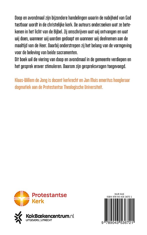 'Tastbare nabijheid' van Klaas-Willem de Jong en Jan Muis is een boek over de doop en het avondmaal, geschikt voor het gesprek in de gemeente. Doop en avondmaal zijn bijzondere handelingen waarin de nabijheid van God tastbaar wordt in de christelijke kerk. De auteurs onderzoeken wat ze betekenen in het licht van de Bijbel. Zij omschrijven wat wij ontvangen en wat wij doen, wanneer wij worden gedoopt en wanneer wij deelnemen aan de maaltijd van de Heer. Daarbij onderstrepen zij het belang van de vormgeving voor de beleving van beide sacramenten.
