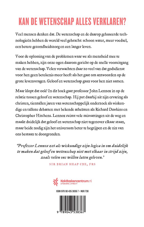 Kan de wetenschap alles verklaren? van John C. Lennox is een populair-wetenschappelijke uitgave over de relatie tussen wetenschap en geloof. De wetenschap heeft de wereld veel gebracht. Voor velen heeft godsdienst daarom geen betekenis meer als het gaat om antwoorden op de grote levensvragen. In dit boek gaat John Lennox in op de relatie tussen geloof en wetenschap. Hij put daarbij uit zijn ervaring als christen, tientallen jaren van wetenschappelijk onderzoek en talloze debatten met bekende atheïsten als Richard Dawkins en Christopher Hitchens. Lennox ruimt vele misvattingen uit de weg en maakt duidelijk dat geloof en wetenschap niet tegenover elkaar staan, maar beide nodig zijn om de zin van ons bestaan te doorgronden.