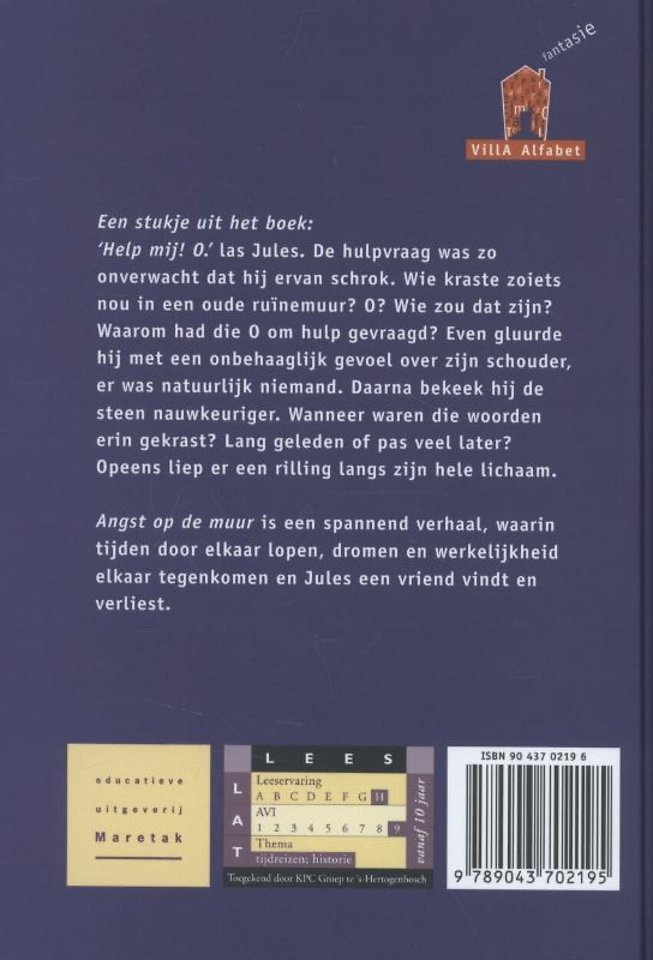 'Help mij! O' las Jules. Wie is O? Hoelang staan die woorden er al? En wat kan Jules doen? Angst op de muur is een spannend verhaal, waarin tijden door elkaar lopen, dromen en werkelijkheid elkaar tegenkomen en Jules een vriend vindt en verliest. Prachtig geïllustreerd door Fiel van der Veen.