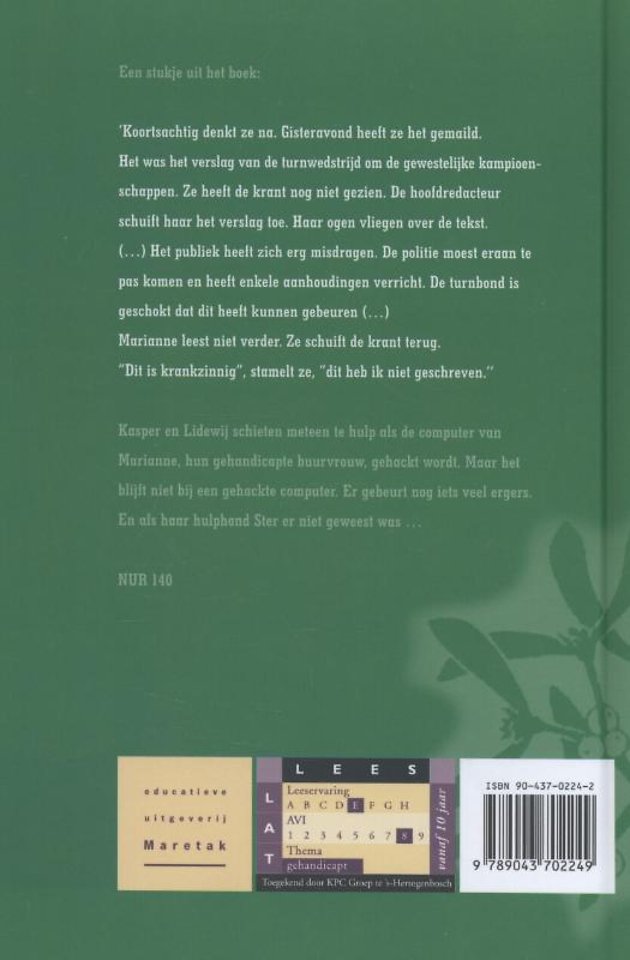 Een stukje uit het boek: 'Koortsachtig denkt ze na. Gisteravond heeft ze het gemaild. Het was het verslag van de turnwedstrijd om de gewestelijke kampioenschappen. Ze heeft de krant nog niet gezien. De hoofdredacteur schuift haar het verslag toe. Haar ogen vliegen over de tekst. (...) Het publiek heeft zich erg misdragen. De politie moest eraan te pas komen en heeft enkele aanhoudingen verricht. De turnbond is geschokt dat dit heeft kunnen gebeuren. (...) Marianne leest niet verder. Ze schuift de krant terug. 'Dit is krankzinnig,' stamelt ze, 'dit heb ik niet geschreven.'' Kasper en Lidewij schieten meteen te hulp als de computer van Marianne, hun gehandicapte buurvrouw, gehackt wordt. Maar het blijft niet bij een gehackte computer. Er gebeurt nog iets veel ergers. En als haar hulphond Ster er niet geweest was ...