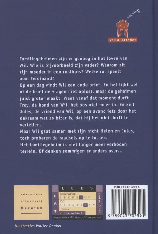 Familiegeheimen zijn er genoeg in het leven van Wil. Wie is bijvoorbeeld zijn vader? Waarom zit zijn moeder in een rusthuis? Welke rol speelt oom Ferdinand? Op een dag vindt Wil een oude brief. en het lijkt wel of de brief de vragen niet oplost, maar de geheimen juist groter maakt! Want vanaf dat moment durft Troy, de hond van Wil, het bos niet meer in. En ziet Jules, de vriend van Wil, op een avond iets door het dakraam wat zo bizar is, dat hij het niet durft te vertellen. Maar Wil gaat samen met zijn nicht Helen en Jules, toch proberen de raadsels op te lossen. het familiegeheim is niet langer meer verboden terrein. Of denken sommigen er anders over ...