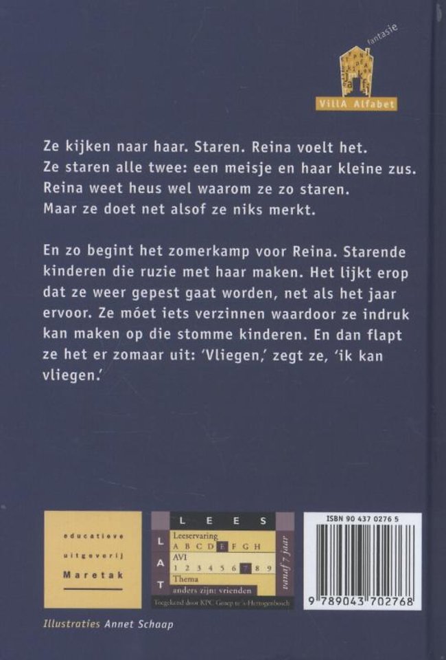 Reina is net aangekomen in het zomerkamp. En ja hoor, ze kijken weer naar haar. Staren. Ze moet heel snel iets verzinnen, anders wordt ze weer gepest, net als vorig jaar. En dan weet ze iets waarmee ze indruk kan maken op die stomme starende kinderen: 'Vliegen', zegt ze, 'ik kan vliegen.' 'Laat maar zien', was het antwoord. En daar staat Reina dan ...