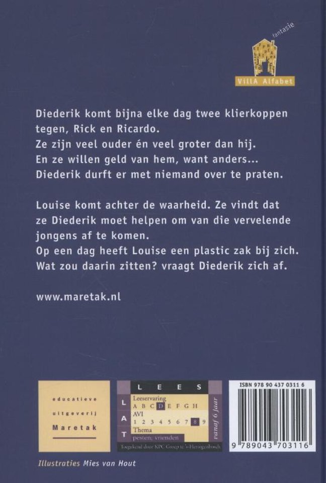Diederik komt bijna elke dag twee klierkoppen tegen, Rick en Ricardo. Ze zijn veel ouder en veel groter dan hij. En ze willen geld van hem, want anders ... Diederik durft er met niemand over te praten.