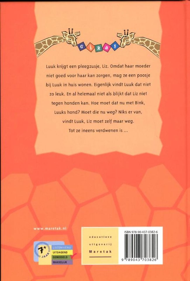 Luuk krijgt een pleegzusje, Liz. Omdat haar moeder niet goed voor haar kan zorgen, mag ze een poosje bij Luuk in huis wonen. Eigenlijk vindt Luuk dat niet zo leuk. En al helemaal niet als blijkt dat Liz niet tegen honden kan. Hoe moet dat nu met Bink, Luuks hond? Moet die nu weg? Niks er van, vindt Luuk, Liz moet zelf maar weg. Tot ze ineens verdwenen is ...