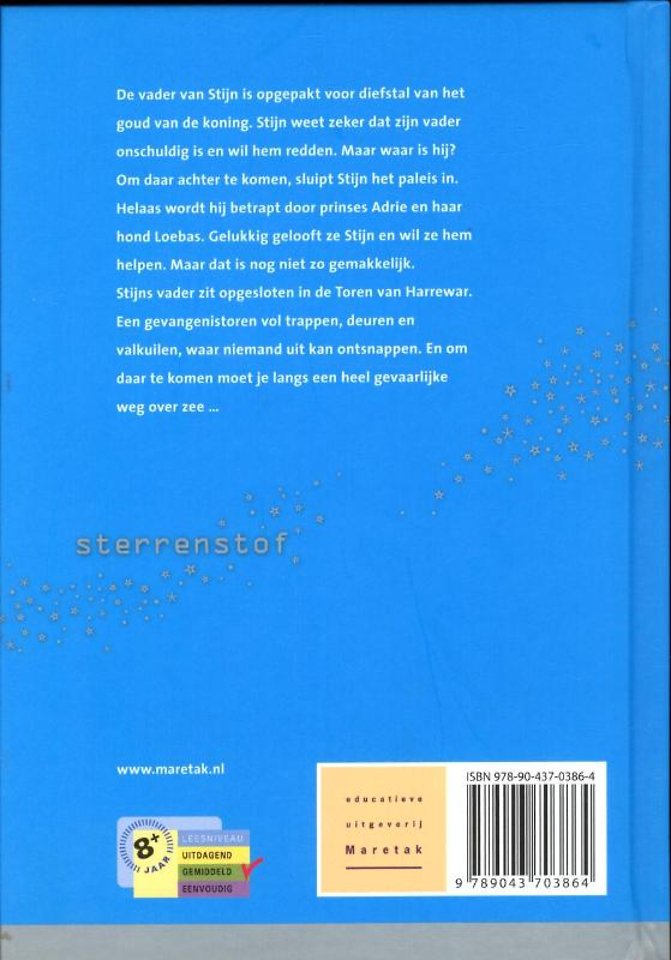 De vader van Stijn is opgepakt voor diefstal van het goud van de koning. Stijn weet zeker dat zijn vader onschuldig is en wil hem redden. Maar waar is hij? Om daar achter te komen, sluipt Stijn het paleis in. Helaas wordt hij betrapt door prinses Adrie en haar hond Loebas. Gelukkig gelooft ze Stijn en wil ze hem helpen. Maar dat is nog niet zo gemakkelijk. Stijns vader zit opgesloten in de Toren van Harrewar. Een gevangenistoren vol trappen, deuren en valkuilen, waar niemand uit kan ontsnappen. En om daar te komen moet je langs een heel gevaarlijke weg over zee ...