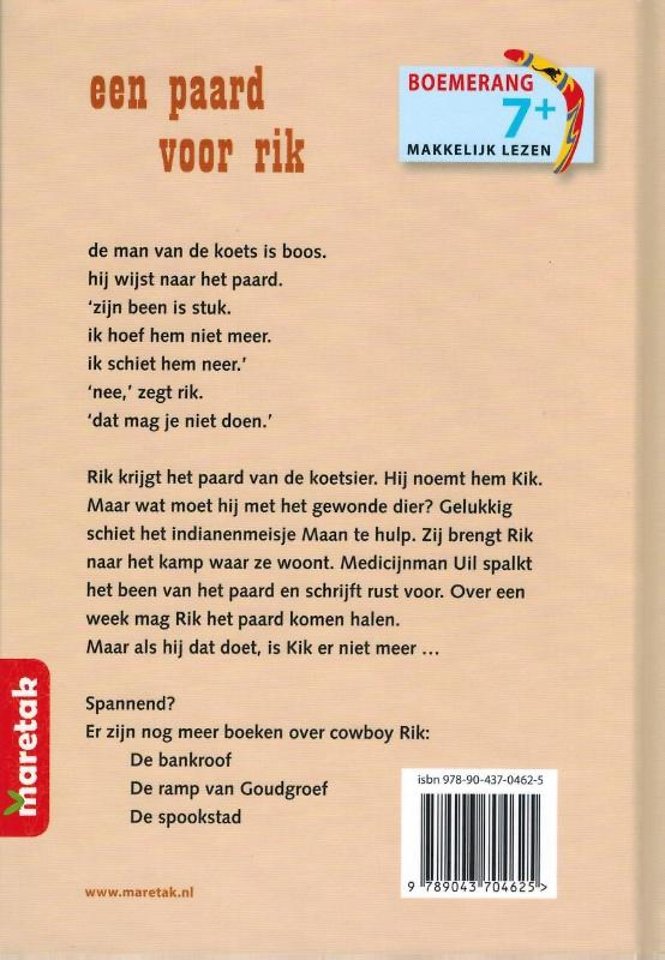 Rik krijgt het paard van de koetsier. Hij noemt hem Kik. Maar wat moet hij met het gewonde dier beginnen? Gelukkig schiet het indianenmeisje Maan te hulp. Zij brengt Rik naar het kamp waar ze woont. Medicijnman Uil spalkt het been van het paard en schrijft rust voor. Over een week mag Rik het paard komen halen.