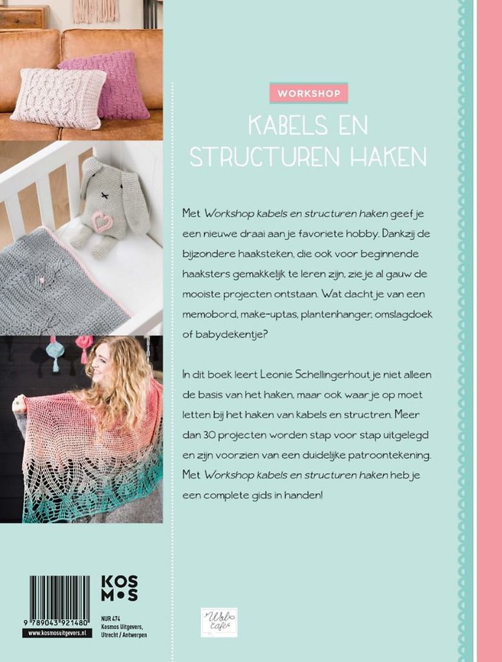 Leonie Schellingerhout (@wolcafé) heeft in Workshop kabels en structuren haken de beste en leukste haakprojecten uit haar eerdere boeken gebundeld. Met deze unieke manier van haken kun je alle kanten op! Van hippe homeaccessoires als wollige kussenhoezen en handige manden tot comfortabele zachte spullen voor de babykamer, een deken met een prachtig motief of een schattige konijnenknuffel. Met deze complete workshop heb je meer dan 30 stap-voor-stapprojecten bij elkaar. De technieken worden uitgelegd met illustraties en tekst, extra handig voor de beginnende kabelhaakster.