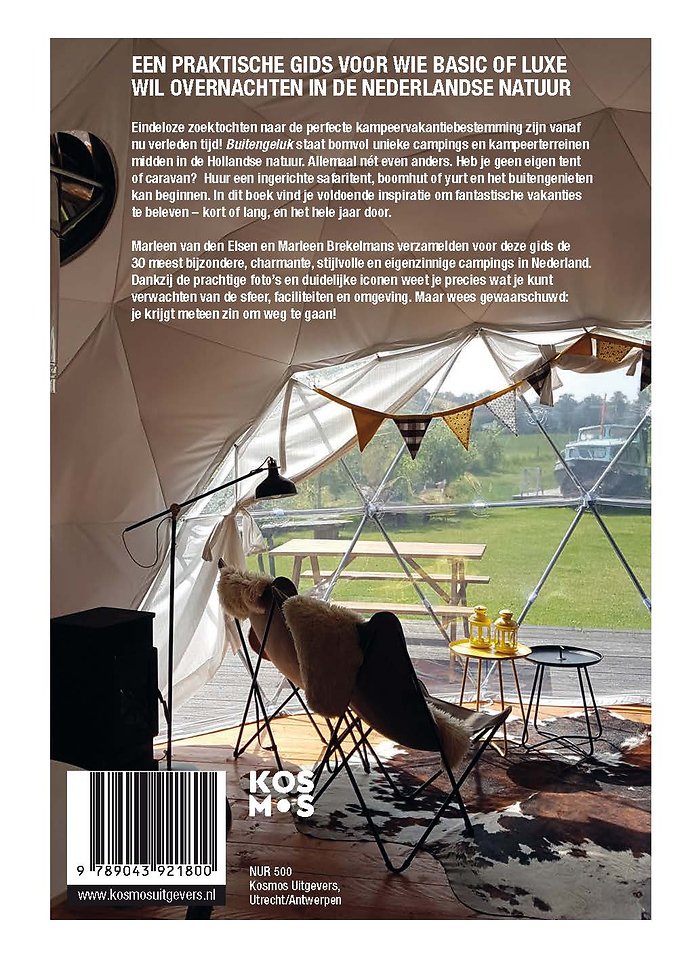 Buitengeluk is een praktische gids over kamperen in Nederland, samengesteld door Marleen van den Elsen en Marleen Brekelmans. In prachtige foto’s laten zij de 30 mooiste natuurcampings, charmecampings, kleine campings en idyllische campings van Nederland zien. Allemaal nét even anders. Heb je geen eigen tent of caravan? Huur een ingerichte safaritent, stoere boomhut of stijlvolle yurt en het buitengenieten kan beginnen. Eindeloze zoektochten naar de perfecte kampeervakantiebestemming behoren tot het verleden met de ideale campinggids voor Nederland.