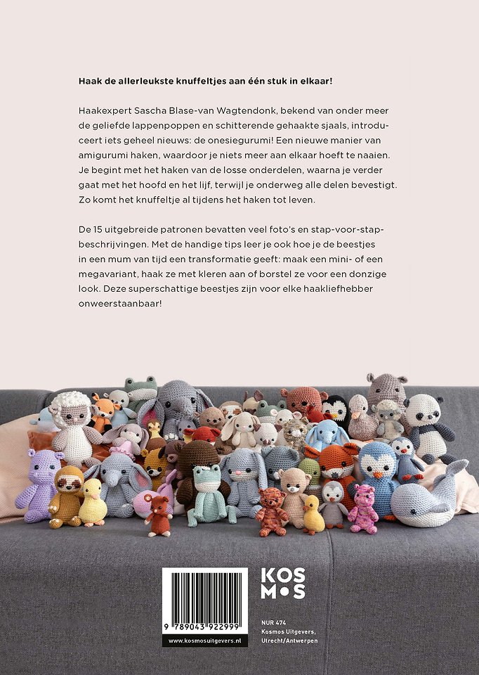 Haakexpert Sascha Blase-van Wagtendonk, bekend van onder meer de geliefde lappenpoppen en schitterende gehaakte sjaals, introduceert iets geheel nieuws: de onesiegurumi! Een nieuwe manier van amigurumi haken, waardoor je niets meer aan elkaar hoeft te naaien. Je begint met het haken van de losse onderdelen, waarna je verder gaat met het hoofd en het lijf, terwijl je onderweg alle delen bevestigt. Zo komt het knuffeltje al tijdens het haken tot leven.