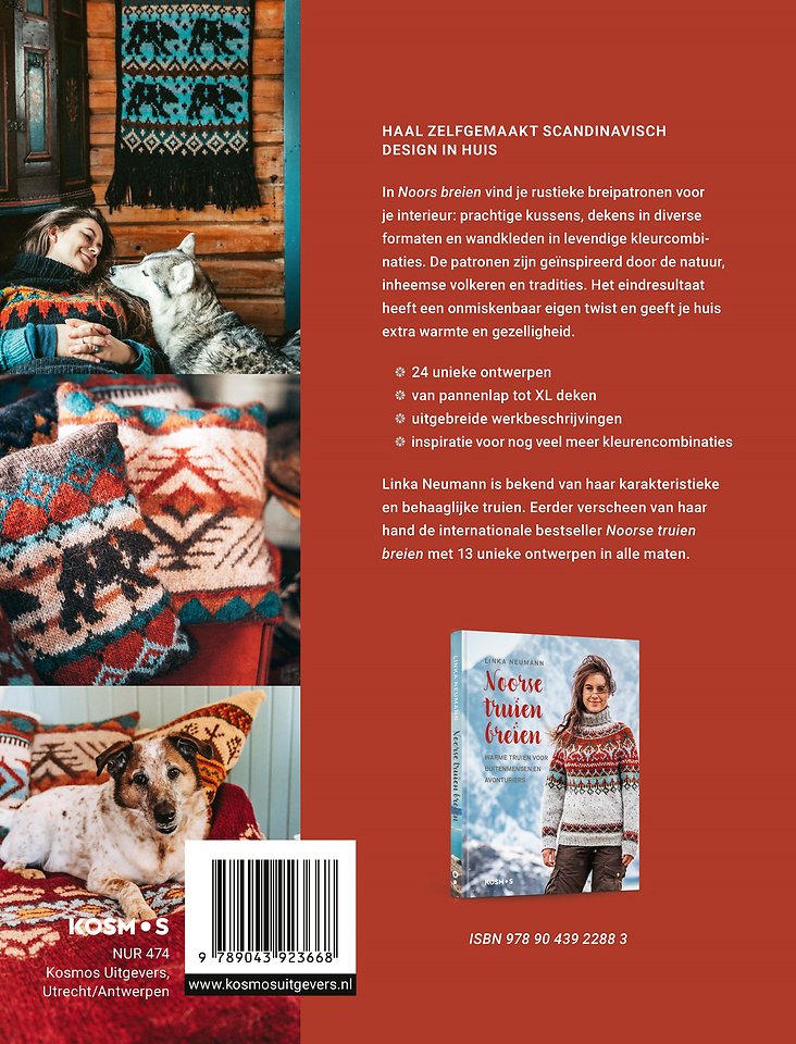 In haar nieuwe boek Noors breien verrast Linka Neumann met stoere en romantische breipatronen voor thuis. Van prachtige kussens tot dekens in diverse formaten en van wandkleden tot tapijten: deze gebreide accessoires mogen absoluut niet ontbreken in je interieur. De ontwerpen zijn geinspireerd op de natuur, inheemse volkeren en tradities, maar hebben een eigen en moderne twist. Natuurlijk brei je ze in de levendige kleurencombinaties die je van Linka kent.