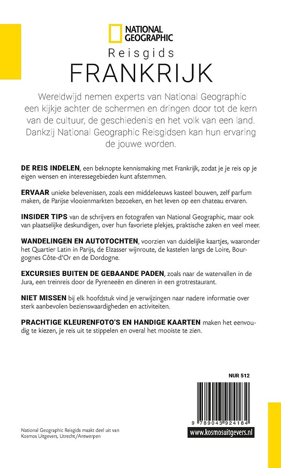Bezoek met deze National Geographic Reisgids Frankrijk het Quartier Latin in Parijs, de Elzasser wijnroute, de kastelen langs de Loire, Bourgognes goudkust en de Dordogne. Of maak zelf parfum, bezoek de Parijse vlooienmarkten, maak een treinreis door de Pyreneeën en ervaar het leven op een chateau.