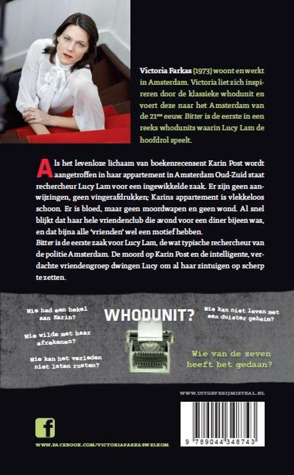 Bitter is de eerste zaak voor Lucy Lam, de wat typische, niet erg collegiale rechercheur van de politie Amsterdam. De moord op Karin Post en de intelligente, verdachte vriendengroep dwingen Lucy om al haar zintuigen op scherp te zetten.