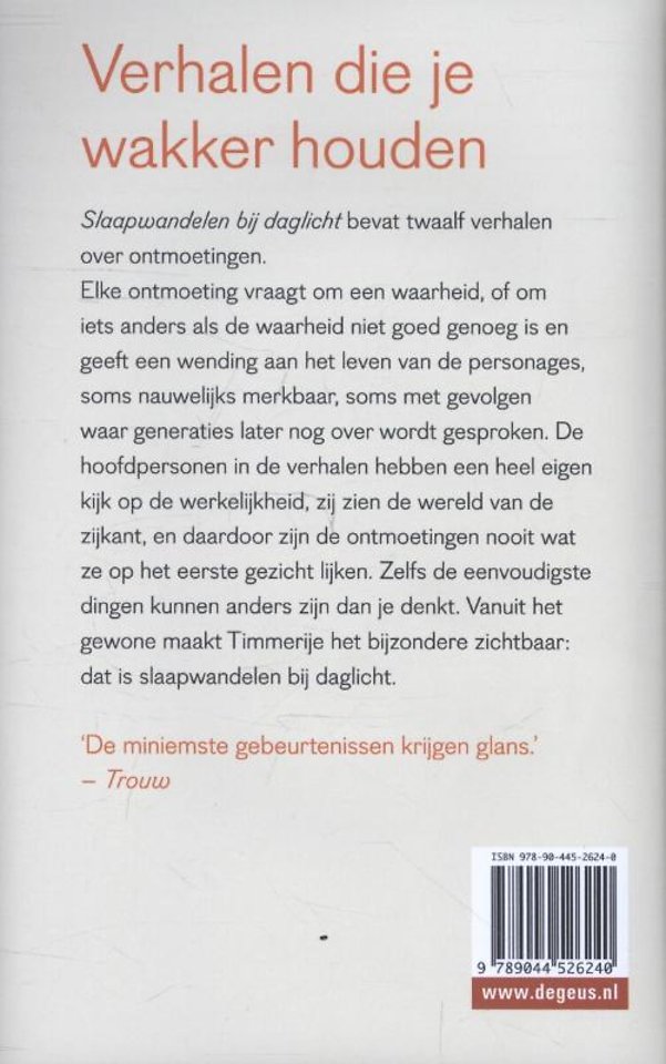 Slaapwandelen bij daglicht bevat twaalf verhalen over ontmoetingen. Elke ontmoeting vraagt om een waarheid, of om iets anders als de waarheid niet goed genoeg is en geeft een wending aan het leven van de personages, soms nauwelijks merkbaar, soms met gevolgen waar generaties later nog over wordt gesproken. De hoofdpersonen in de verhalen hebben een heel eigen kijk op de werkelijkheid, zij zien de wereld van de zijkant, en daardoor zijn de ontmoetingen nooit wat ze op het eerste gezicht lijken. Zelfs de eenvoudigste dingen kunnen anders zijn dan je denkt. Vanuit het gewone maakt Timmerije het bijzondere zichtbaar, dat is slaapwandelen bij daglicht.