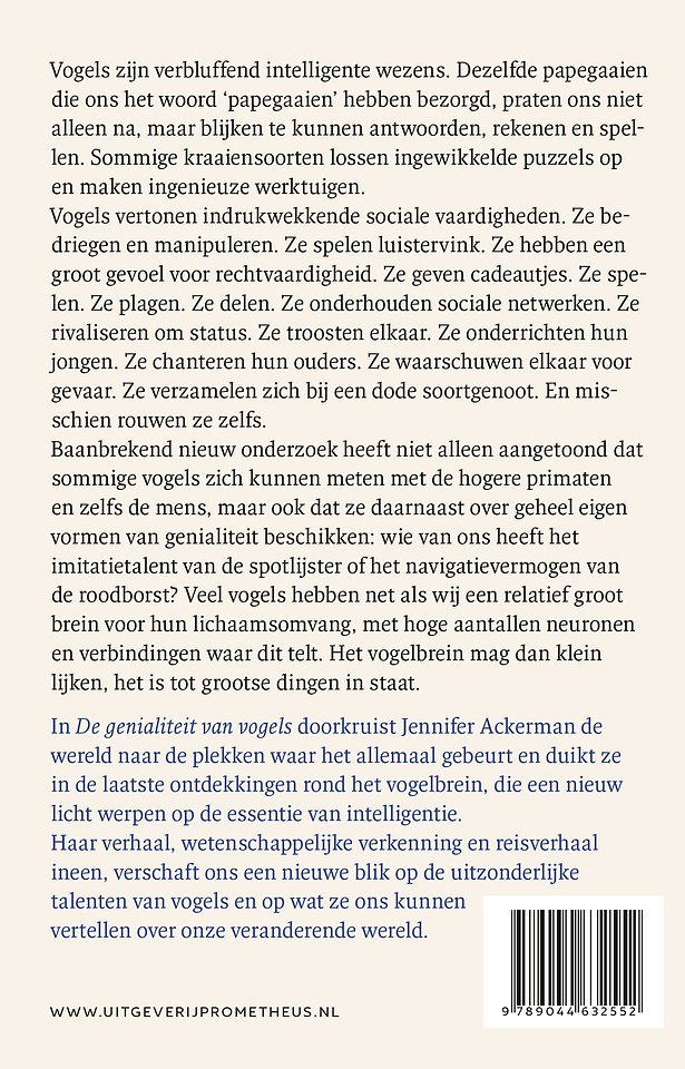 Baanbrekend nieuw onderzoek heeft niet alleen aangetoond dat sommige vogels zich kunnen meten met de hogere primaten en zelfs de mens, maar ook dat ze daarnaast over geheel eigen vormen van genialiteit beschikken: wie van ons heeft het imitatietalent van de spotlijster of het navigatievermogen van de roodborst? Veel vogels hebben net als wij een relatief groot brein voor hun lichaamsomvang, met hoge aantallen neuronen en verbindingen waar dit telt. Het vogelbrein mag dan klein lijken, het is tot grootse dingen in staat.