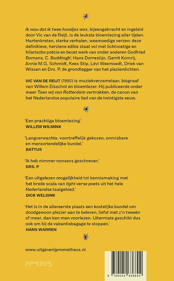 Ik wou dat ik twee hondjes was, bijeengebracht en ingeleid door Vic van de Reijt, is de leukste bloemlezing aller tijden. Hartenkreten, sterke verhalen, weemoedige verzen: deze definitieve, herziene editie staat vol met lichtvoetige en hilarische poëzie en bevat werk van onder anderen Godfried Bomans, C. Buddingh’, Hans Dorrestijn, Gerrit Komrij, Annie M.G. Schmidt, Kees Stip, Lévi Weemoedt, Driek van Wissen en Drs. P, de grondlegger van het plezierdichten.