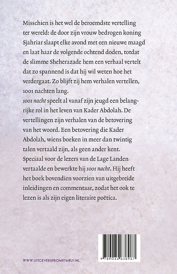 1001 nacht speelt al vanaf zijn jeugd een belangrijke rol in het leven van Kader Abdolah. De vertellingen zijn verhalen van de betovering van het woord. Een betovering die Kader Abdolah, wiens boeken in meer dan twintig talen vertaald zijn, als geen ander kent.