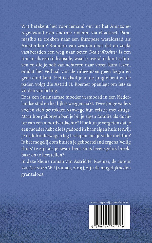 Wat betekent het voor iemand om uit het Amazoneregenwoud over enorme rivieren via chaotisch Paramaribo te trekken naar een Europese wereldstad als Amsterdam? Brandon van zestien doet dat en zoekt vastberaden een weg naar beter. DealersDochter is een roman als een tijdcapsule, waar je overal in kunt schuiven en die je ook van achteren naar voren kunt lezen, omdat het verhaal van de inheemsen geen begin en geen eind kent. Het is alsof je in de jungle bent en de paden volgt die Astrid H. Roemer openlegt om iets te vinden van heling.