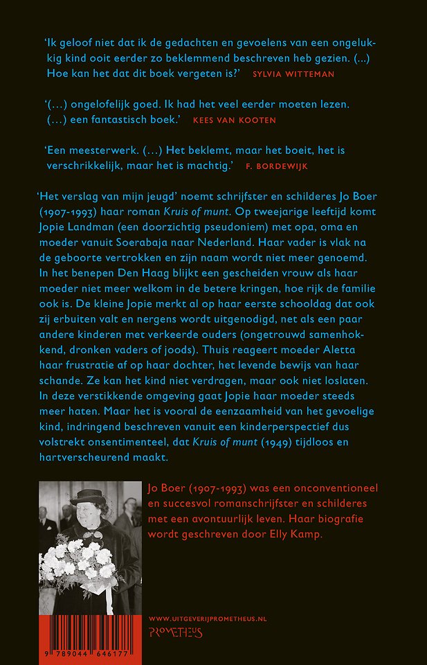 ‘Het verslag van mijn jeugd’ noemt schrijfster en schilderes Jo Boer (1907-1993) haar roman Kruis of munt. Op tweejarige leeftijd komt Jopie Landman (een doorzichtig pseudoniem) met opa, oma en moeder vanuit Soerabaja naar Nederland. Haar vader is vlak na de geboorte vertrokken en zijn naam wordt niet meer genoemd. In het benepen Den Haag blijkt een gescheiden vrouw als haar moeder niet meer welkom in de betere kringen, hoe rijk de familie ook is. De kleine Jopie merkt al op haar eerste schooldag dat ook zij erbuiten valt en nergens wordt uitgenodigd, net als een paar andere kinderen met verkeerde ouders (ongetrouwd samenhokkend, dronken vaders of joods). Thuis reageert moeder Aletta haar frustratie af op haar dochter, het levende bewijs van haar schande. Ze kan het kind niet verdragen, maar ook niet loslaten. In deze verstikkende omgeving gaat Jopie haar moeder steeds meer haten. Maar het is vooral de eenzaamheid van het gevoelige kind, indringend beschreven vanuit een kinderperspectief dus volstrekt onsentimenteel, dat Kruis of munt (1949) tijdloos en hartverscheurend maakt.