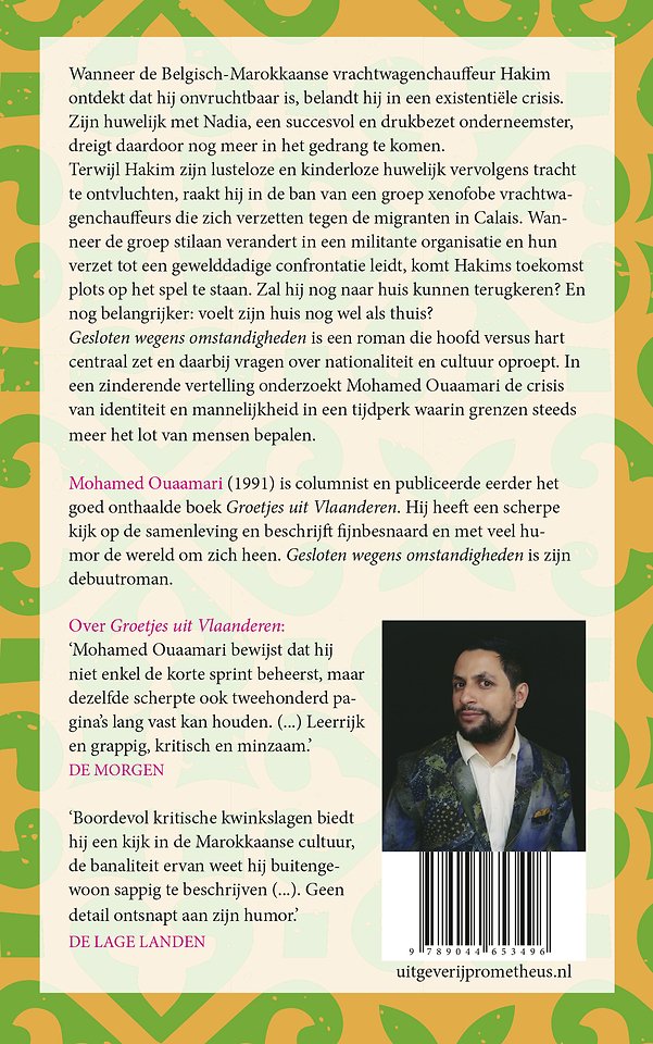 Gesloten wegens omstandigheden is een roman die hoofd versus hart centraal zet en daarbij vragen over nationaliteit en cultuur oproept. In een zinderende vertelling onderzoekt Mohamed Ouaamari de crisis van identiteit en mannelijkheid in een tijdperk waarin grenzen steeds meer het lot van mensen bepalen.