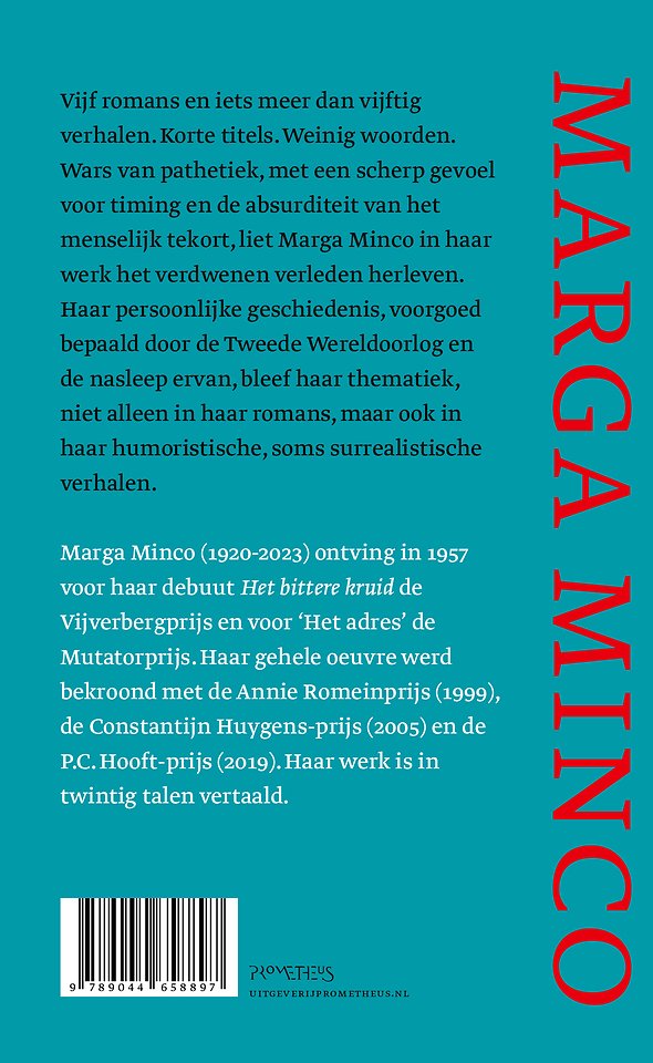 Marga Minco (1920-2023) ontving in 1957 voor haar debuut Het bittere kruid de Vijverbergprijs en voor ‘Het adres’ de Mutatorprijs. Haar gehele oeuvre werd bekroond met de Annie Romeinprijs (1999), de Constantijn Huygens-prijs (2005) en de P.C. Hooft-prijs (2019). Haar werk is in twintig talen vertaald.