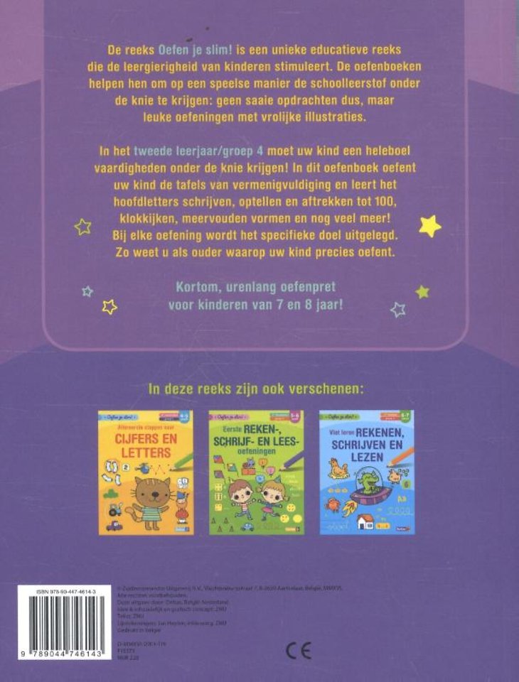 In het tweede leerjaar/groep 4 moet uw kind een heleboel vaardigheden onder de knie krijgen: de tafels van vermenigvuldiging leren, rekenen tot 100, schrijven zonder fouten, enzovoort. Dit oefenboek staat boordevol speelse oefeningen die gemaakt zijn om uw kind thuis verder te laten oefenen wat het op school geleerd heeft. Want oefening baart kunst! Bij elke oefening in dit boek wordt het specifieke doel uitgelegd. Zo weet u als ouder waarop uw kind precies oefent.
